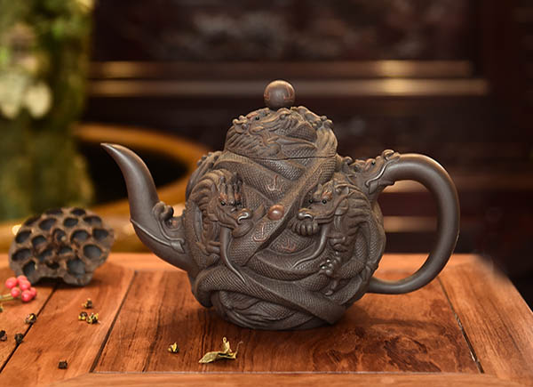 葛岳純父子皆擅長花貨的制作,其中家族代表作九龍至尊壺是由葛超美設計,其父親葛岳純制作完成,遠看壺型整體氣韻流暢,近看做工精美無暇,是父子合作的經典之作,現已注冊外觀專利和終身版權。后葛超美在其父親傳統技法的基礎上,吸收其藝術菁華,創造革新,制作出更為精致、富有立體感的九龍至尊壺,九龍盤壺戲珠,浮雕云騰致雨,精致于細發,大氣于天地,寓意天降祥瑞,國泰民安。